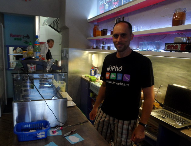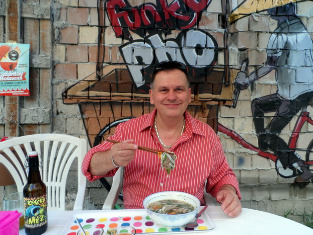 Szabolcs András informatikai szakember, Amerikában dolgozott, a CocaCola alkalmazta. Ez álomállásnak tűnik innen, a távolból, s talán az is volt, de hazajött, majd négy hosszú éven át üzlethelyiséget keresett, ahogy mesélte, mire összeállt a Funky Pho – az, amit a képeken is láthatsz. Érdekes a világ. András területe egyébként leginkább a marketing, s ha az üzletben körbenézünk, a multis arculattervezés alaposságának és egy rombüfének a sajátos koktélját láthatjuk, amire az üzlettel szemközti üres telken álló autóparkolóban kialakított „kerthelyiségben” kerül fel a korona.