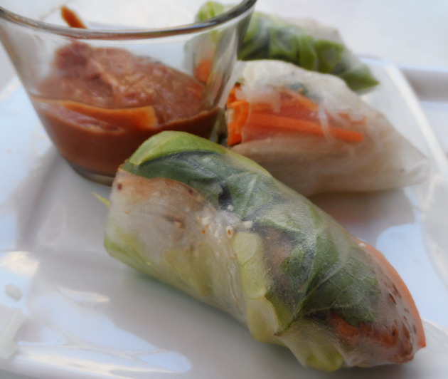 A pho leves után a bónusz tavaszi tekercsek következtek, külön-külön háromféle töltelékkel, hússal, tofuval a képen is látható mogyorókrémmel (mogyoróvaj+Hoisin szósz+?)