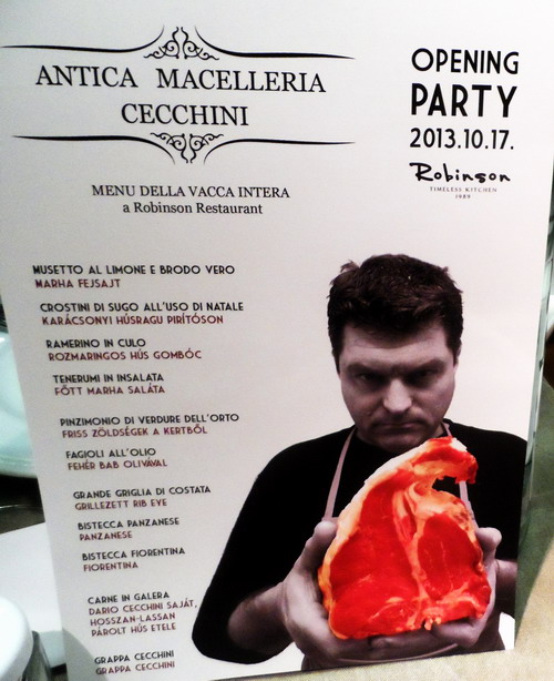 Dario Cecchini első alkalommal járt Budapesten. A Városligetben álló, megújult Robinson Restaurantban az ő húsai, ételei is étlapra kerültek. Ezeket a húsokat és ételeket érkeztünk kóstolni sokad magunkkal.