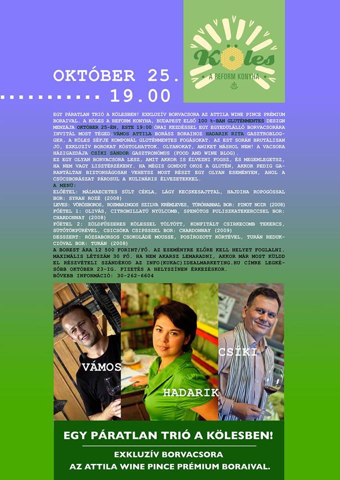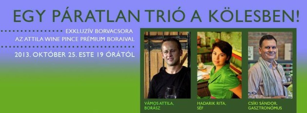 PÁRATLAN TRIÓ – Borvacsora a Kölesben 2013. október 25-én este , 19:00 órától. A Borász Vámos Attila. A séf Hadarik Rita (Rita Konyhája blog). A házigazda pedig jómagam vagyok. mindennek eljön az ideje, ennek is eljött. A csapat nagyszerű, ezért joggal várható, hogy nagyszerű és kivételes eseménynek nézünk elébe. Összesen 30 hely van, s azok közül számos már az első órában betelt.