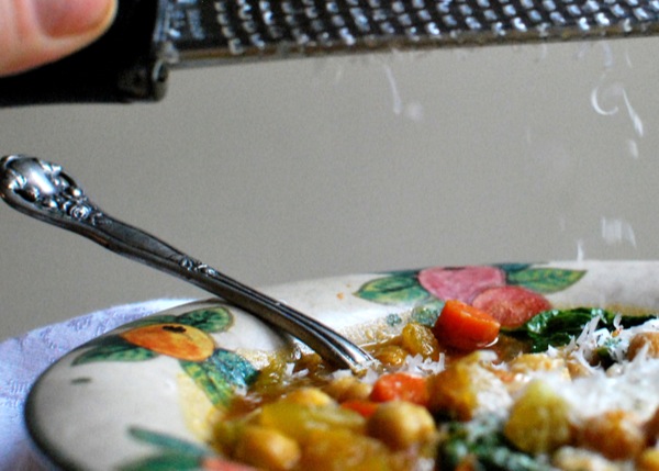 Elkészítése: A legnagyobb lábosunkban melegítsük fel az olajat. Dinszteljük meg benne a vöröshagymát, a fokhagymát és a szárzellert, amíg az illatuk érezhető nem kezd lenni. Adjuk hozzá a tököt, a sárgarépát, és pároljuk tovább, amíg a vöröshagyma üvegessé nem válik. A zöldek (kelkáposzta, mustár, stb.) és a sajt kivételével adjunk hozzá az összes többi hozzávalót és forraljuk fel. Csökkentsük a hőmérsékletet, és hagyjuk gyöngyözve főni, amíg a (csicseriborsó és a) sütőtök megpuhul. Kóstoljuk meg, és adjunk még hozzás sót, paprikát, cayenne borsot ha szükséges. Vegyük egészen kicsire a lángot, majd keverjük bele a kelkáposztát, hogy tálalás előtt kicsit összeessen, de azért még tartsa meg az alakját. Tálaláskor gy jó nagy adag reszelt sajttal is szórjuk meg. Tipp: lefagyasztható.