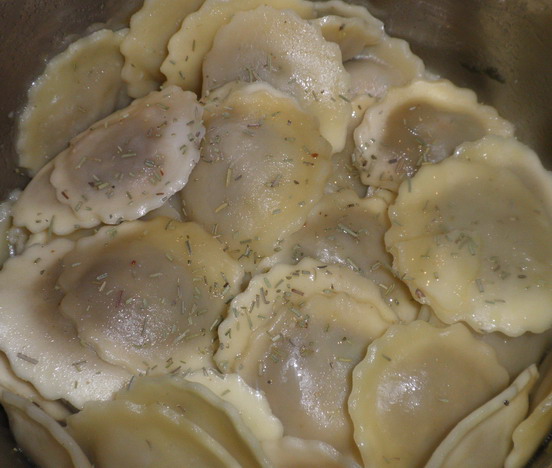 A serpenyőbe tett szeleteket rozmaringgal szórtam meg, s a húsok mindkét oldalát 30-30 másodpercig sütöttem, majd kevés fehérbort öntöttem a serpenyőbe, s így folytattam a sütést magas hőmérsékleten újabb 60-60 másodpercig, a hús mindkét oldalát sütve. A hús elkészülte előtt a serpenyőbe kevertem az előzetesen kevés húslevesben vajjal felmelegített tortellit és enyhén megpirítottam. A húsra vékony szelet vajat is helyezzünk, ami szépen ráolvad. Azonnal tálalható (ennél a szeletvastagságnál nem feltétlenül szükséges a húst pihenteti). Mindez fotókkal elmesélve így fest: