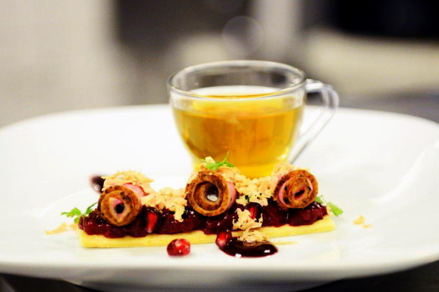 - Leves fogás: Forró kacsa-infúzió mellé kacsa melle, mája és gránátalmás csatni (Horváth Szilveszter chef, La Maréda Étterem, Győr)