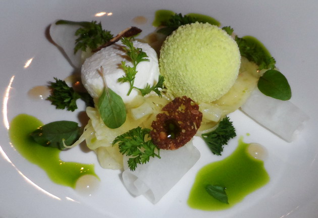 - Előétel: Tejszín-dús kecskesajt turbolya esszenciával, köré édeskömény költemény (Györffy Árpád chef, Aranykaviár Étterem, Budapest)