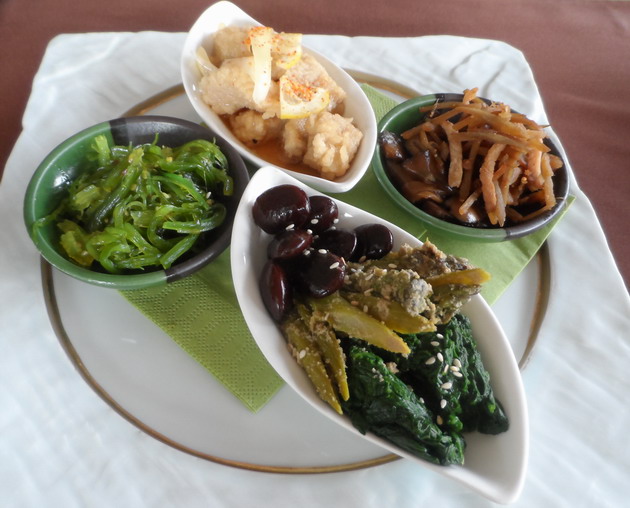 Az óramutató járásával megegyezően: burgonyakeményítő kéregben sütött tonhal, rizsecetes mártásban, sertés és lapulevél gyökér, édes bab, spárga és spenót, majd, a 9-es magasságában, alga.