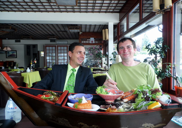 A FUJI JAPÁN Étterembe Spiegelberg Stefán barátom vitt el, akinek a borai az étterem több, mint ötven borból álló borválogatásába is bekerültek. Stefán régóta noszogatott már, de most beadtam a derekam, és nem is bántam meg. Megkóstoltuk a dél-spanyol vizekben halászott tonhalat, a malajziai fekete tigrisrákot, az angolnát, kagylót, rákokat, algákat, wasabit, gyömbért, de bélszín és pankóban bundázott hús és japán omlett is asztalra került. Az ételekhez ezúttal nem bort, hanem japán sört ittam.