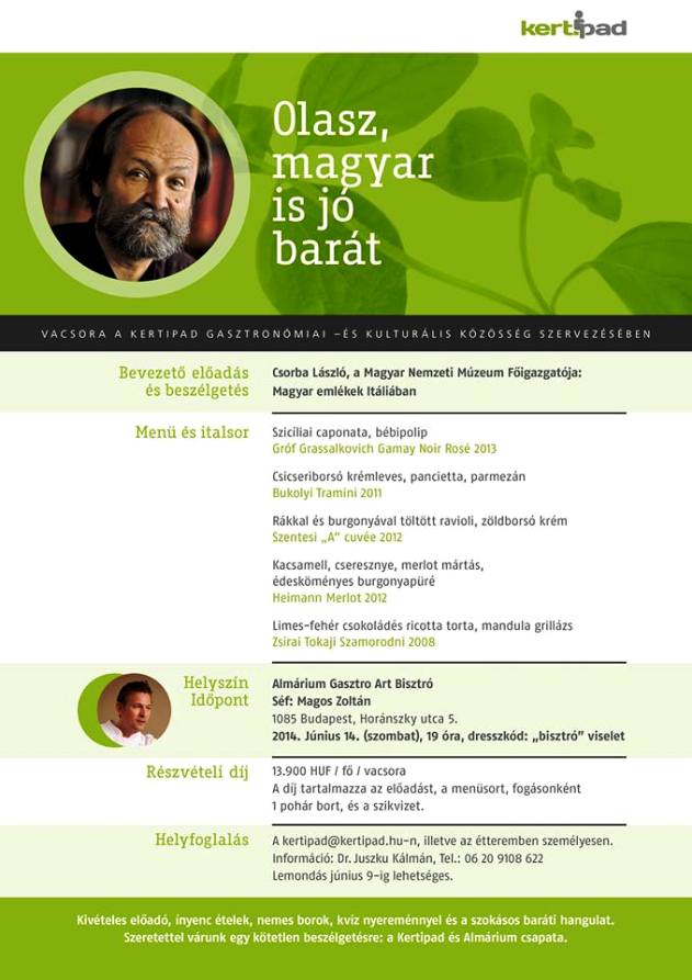 A KERTI PAD Gasztronómiai és Kulturális Közösség megtisztelt vendége voltam a közelmúltban az Almárium Bisztróban tartott szezonzáró olasz vacsorán. A Kerti Pad lelke, Dr. Juszku Kálmán hívott meg, talán azért is, mert a vacsora meghívott séfje éppen Magos Zoltán barátom volt.