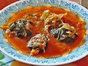 „Szervusz Sándor! Írtad, hogy érdekel a töltött káposztánk, most kis mesével kiegészítve itt írom le. A kovászolt káposztával készült töltött káposztával Erdélyben találkoztam először, és rögtön beleszerettem. Ezt nyári töltöttkáposztának is nevezik, mert a lágyan savanykás íze nagyon üdítően hat a nagy melegben is. Ez az étel nem tűr cupákos húsokat, de a nehéz füstölt ízt sem. Ez utóbbi csak jelzés értékkel lehet jelen benne. Tavalyelőtt Szabolcsban jártunk – gombásztáborban – ott kaptunk egy vacsorára paradicsomos töltött káposztát, mint helyi specialitást. Nagyon szerethető! Ezekből kiindulva készítettük „nemzetközi” ételünket, amelybe belecsempésztük a dolmát is.”