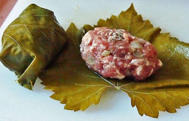 „A káposztát legyalultuk, Egy nagyobb edénybe kaprot tettünk és erre hámoztuk a káposztát, ami közé csombor ágakat és 1-2 gerezd fokhagymát kevertünk aprítva. Forró sós vízzel felöntöttük, s a tetejére erjesztő anyagként pirított kenyeret tettünk (ez lehet kovász is, de vannak, akik szeletelt burgonyával erjesztik) Ha káposzta levélbe gondolnád a tölteléket csomagolni, a káposzta közepéről kitördelt lapikat (vastag erüktől megszabadítva) az edény aljára tedd, s erre halmozd az aprólékot. Napos, meleg helyen pár nap alatt megsavanyodik és már használható is. Most néhány tőke szőlőnk kacsolás utáni friss hajtásokon sok-sok zsenge levelet hozott, úgy gondoltuk, hogy ezekbe tekerjük a tölteléket. Kiegészítettük még „örökölt” tormaültetvényünk új (halányzöld) leveleivel is. Ezeket leforráztuk, így használhatóbb.