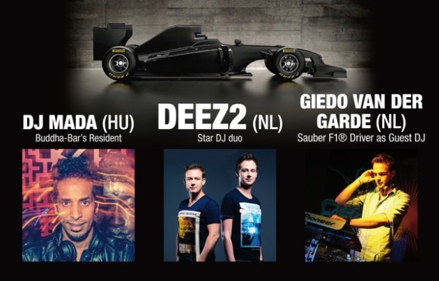 A DEEZ2 DJ duó tagja Quino du Breuil, az elektronikus zenében világszerte elismert, 21 éves őstehetség és Norbert de Bot, aki Official Pioneer DJ iskolájában képzi a fiatalokat, miközben a legnagyobb holland klubok és nemzetközi fesztiválok sztárfellépője. A formabontó csapat csak erre az estére érkezik Budapestre. Giedo van der Garde, a Sauber csapat pilótája a Buddha-Bar DJ pultjában a tavalyi hatalmas buli után megint megmutatja, hogy nem csak a kormány, hanem a lemezjátszó keverője is jól áll a kezében. A hangulatot rezidens DJ-nk, Mada készíti elő.