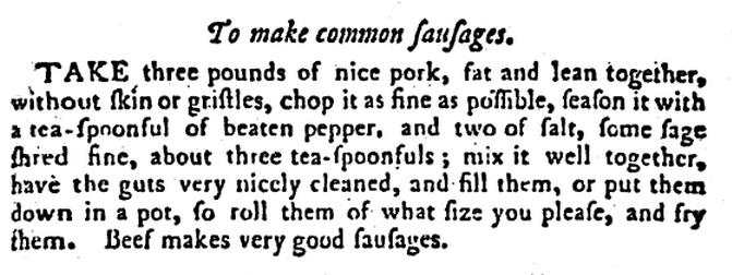 „Végy egy font [453g] marhát, és félfontnyi [227g] legfinomabb faggyúval aprítsd össze, majd keverj [hozzá] háromnegyed font [340g] nagy darabokra vágott faggyút. Fűszerezzed borssal, szegfűszeggel, szerecsendióval, nagy mennyiségű, apróra vágott fokhagymával, némi fehérborecettel, kevés babér-sóval, és asztali sóval, egy pohár vörösborral és rummal. Mindezeket keverd jól össze, majd vedd a legnagyobb belet, amit csak találsz, és nagyon szorosan töltsed bele, aztán lógasd fel a kéményben és füstöld egy hétig, vagy tíz napig. Szellős helyen lógasd, amíg ki nem száradnak. Egy évig is eltarthatod. Borsókásába főzve, sütve, pirított kenyerek között, és omlettben is nagyon jó.”