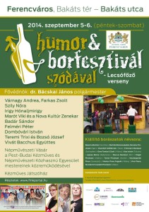 HUMOR & BORFESZTIVÁL szódával – a Ferencvárosban, 2014. szeptember 5-6-án, pénteken és szombaton. A helyszín, a Bakáts tér. Humoristák, borászok, lecsófőző verseny, éttermek, jó hangulat és jó kedély. És mindez nem vicc! A Humor & Borfesztivál szódával 2014 fővédnöke Ferencváros polgármestere, dr. Bácskai János. Tehát: pénteken és szombaton a Bakáts téren várják az érdeklődőket koncertekkel, humoristákkal, borokkal, kiállításokkal, népművészeti vásárral, lecsófőző versennyel.