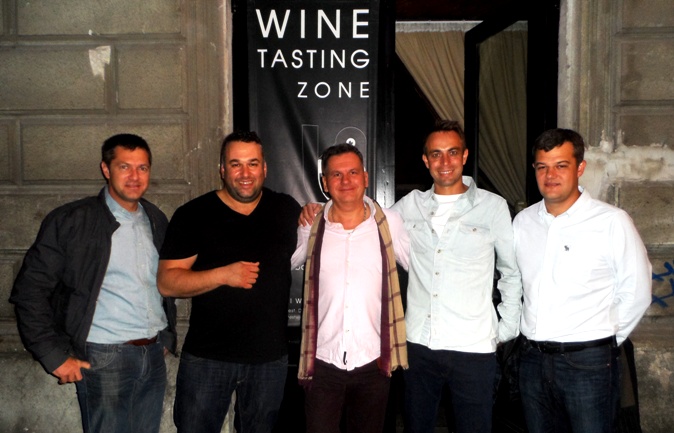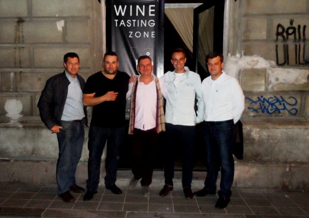 A dél-afrikai Stellenrust borászat borainak kóstolója a Doblo Borbárban. A fotó a bár bejárata előtt készült. Balról második: Popovits Dávid tulajdonos. Középen: Csíki Sándor. A képen a Stellenrust képviseletében: Dr. Johannes Swart, Tertius Boschoff és Koble van der Westhulzen.