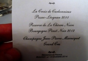 SAM_9335FRANCIA REZIDENCIA – a Francia Rezidencia a XII. kerületben, a Csaba utcában áll. Ide szólt az a meghívó, mely szerint: Roland Galharague Franciaország magyarországi nagykövete meghívja Csíki Sàndor urat egy 2014. november 14-én, pénteken 19h 30-kor tartandó vacsorára. Nos, könnyen belátható, hogy egy ilyen kedves invitálásnak aligha lehet ellenállni. A meghívó felszólítása szerint: „Fedezze fel