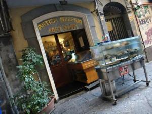 Egészen az 1830 körüli évekig, az utcai kemencékben sült pizzákat még kizárólag az ételt melegen tartó tárolóedényt (stufa) fejükön egyensúlyozó utcai árusok és házalók adták el. Ezt az értékesítési hagyományt a legrégibbnek számító valódi pizzéria, az L’Antica Pizzeria Port’Alba változtatja meg először. A cég jogelődje ugyan már 1738 óta készített pizzákat, azonban a Nápoly központjában (Via Port’Alba) 1830-ban megnyílt pizzéria abban tért el az elődjeitől és kortársaitól, hogy az itt készült pizzákat a vendégek már éttermi körülmények között, asztaloknál ülve fogyaszthatták el.