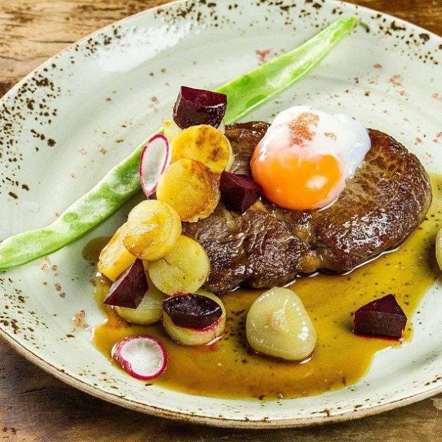 Malacfülsaláta: „Ez úgy született, hogy az ételek készítése után sok malacfül megmaradt, és gondoltam, kezdeni kellene velük valamit. Még jó roppanósra megfőztem, de aztán ott álltam fölötte. És akkor hirtelen előjött egy régi recept, az ökörszáj saláta, amihez főzés után összepréseltük az ökörszájat és vékony csíkokra vágtuk– ezt most mi malacfüllel helyettesítettük. Megcsináltam ugyanazt a régi receptet. Összeszedtem mindent, amit csak találtam hozzá a konyhában: egy kis lilahagymát, vajretket, csemege uborkát, snidlinget, petrezselyemzöldet, sót, borsot, kakukkfüvet, nagyon finom olíva olajat. Ezekhez tettem a vékonyra vágott malacfület, és hagytam együtt állni egy éjszakán át. A végeredmény egy ízletes, modern előétel lett, amit vinaigrett-tel és frissen reszelt tormával tálalunk. Magam is meglepődtem, milyen finom lett, mennyivel jobb, mint az eredeti.” (Rosenstein Róbert)