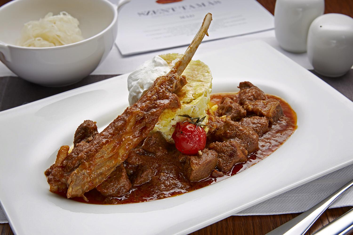Azóta újabb kecske fogások készültek Mádon, mint a képen szereplő pörkölt. Kecskepörkölt, galuska felfújt, káposzta saláta. (Első Mádi Borház és Bisztró, Mád)