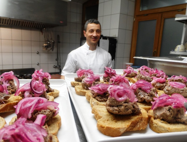 Horváth Gábor séf (Gusteau, Első Mádi Borház és Bisztró) a Gusteau konyhájában. Előtte: kecske rilette, hagymával.
