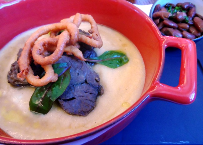 Ottjártunkkor egy másfél éves, 35 kilós búr nőstény kecskéből készült a konfitált kecske lapocka, sült krémes kukoricával és babbal. (Első Mádi Borház és Bisztró, Mád)