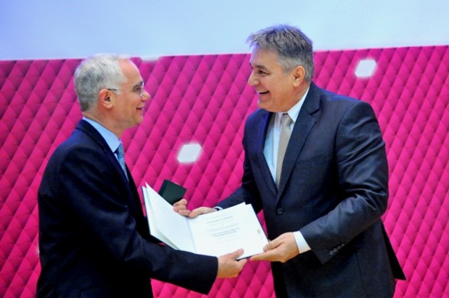 Prof. Dr. Bedros J. Róbert, a MOMOT alapító elnöke átveszi a kitüntetést Balog Zoltán minisztertől (Fotó: Bartos Gyula/Emmi)