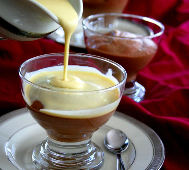 A krém hasonlóan készül, mint az előző receptben. A lisztet a cukorral felvert tojássárgájához adjuk, a forró tejet ezután keverjük hozzá. Luis Diat (Escoffier alapján) a kávé ízű angolkrémnél fele tejhez fele kávét javasol, de a csokoládé ízű krémet is megemlíti. A csokoládé ízű angolkrémnél a csokoládét a tejbe törjük, feloldjuk és így adagoljuk a felvert tojássárgája/cukor keverékhez.