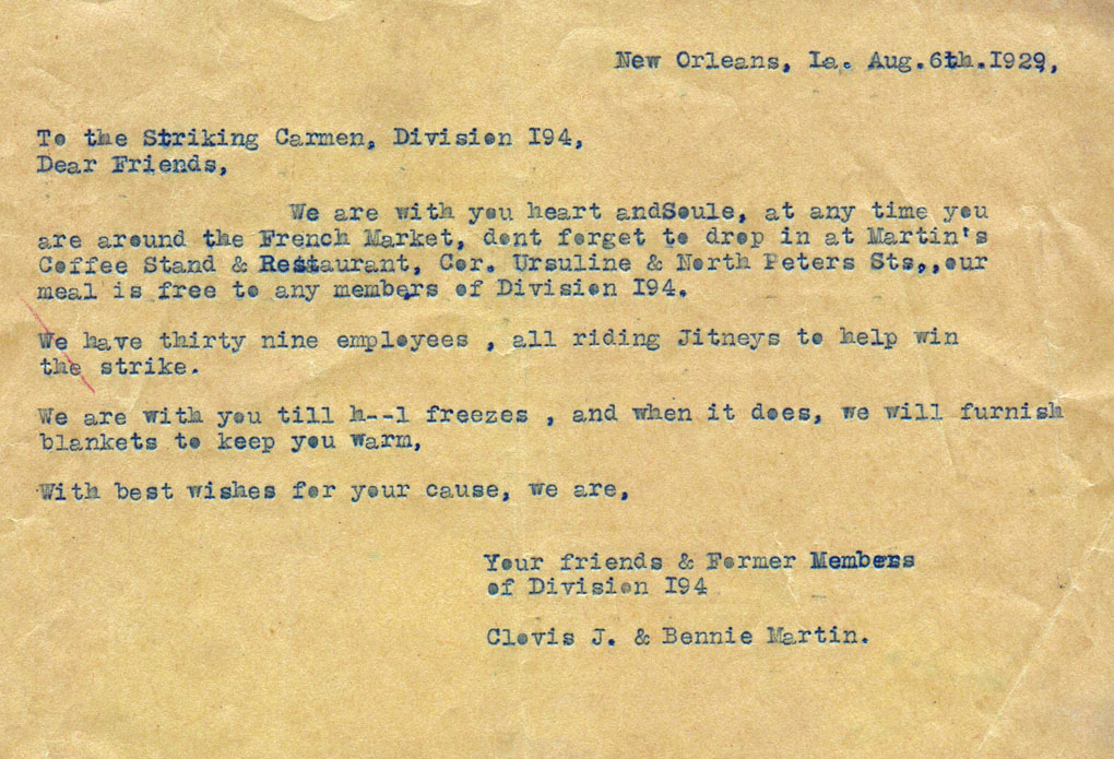 A Martin testvérek levele a sztrájkolókhoz (1929), Louisiana Research Collection, Tulane University Libraries