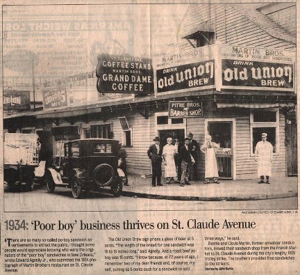 A Po’ Boy szendvicset, mondják New Orleans helytörténészei, Benjamin (Bennie) és Clovis Martin „találták” fel 1929-ben. A Martin testvérek az 1910-es évek közepén Acadiából költöztek a városba. Kezdetben mindketten a helyi villamosokon dolgoztak, amíg 1922-ben meg nem nyílt éttermük, a Martin Brothers’ Coffee Stand and Restaurant. A korábban a közlekedési vállalatnál, az I94-es divízióban végzet munka és a villamosvezetők és kalauzok szakszervezetéhez való tartozás vezetett el ahhoz, hogy a French Marketnek ez az étterme végül az amerikai dél egyik legendás ételének, a Po’ Boy szendvicsnek a szülőhelyévé vált. Mindehhez Amerika történelmének egyik legelszántabb, s leghevesebb sztrájkja is kellett.