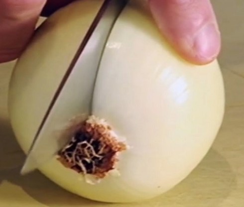 Szépen kivitelezett vágás, ahol úgy vág a kés ,hogy a deszkán minél kevesebb hagyma lé maradjon vissza. – és ez nem csak a kés élességén múlik.