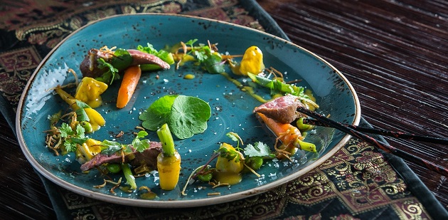 - Főétel: Nyelvhal filé, feketecsalán salsa, vagy Bárány bélszín tamarinddal és sárga curryvel