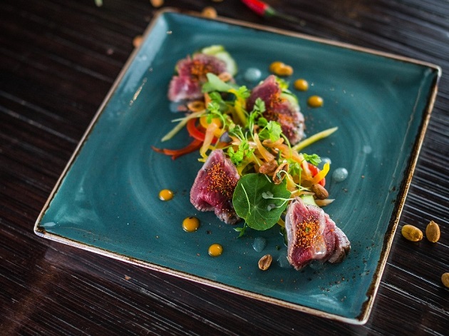 - Előétel: Marinált marhahúsos saláta yuzuval és savanyú uborkával