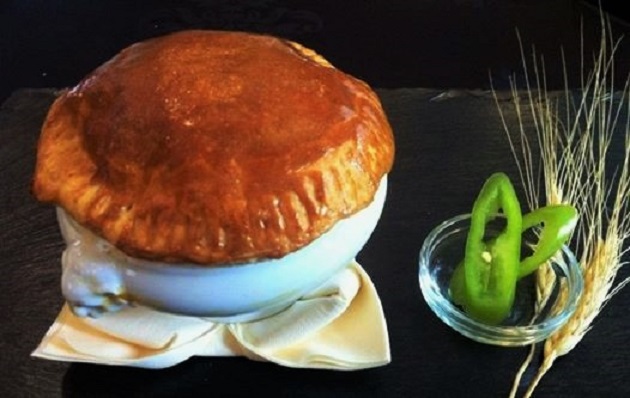 - A leves fekete szarvasgombát, apróra vágott főtt marhahúst és zöldséget (zeller, sárgarépa, burgonya) tartalmaz, lepirított csontokból, marhafarokból hosszan készült, redukált marha alaplében, házi levelestészta-fedéllel.