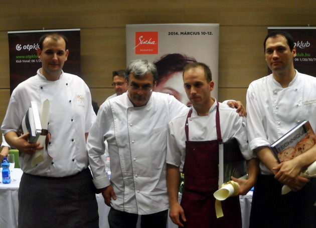 Hagyomány és Evolúció döntő (2013): a képen balról: Szűcs Zoltán (Salon Étterem, Budapest), Molnár B. Tamás, Molnár Gábor (Vinotheka, München) és Horváth Szilveszter (La Maréda, Győr)