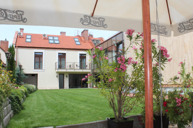 A szekszárdi Merops Hotel Mészáros ápolt belső udvara az étterem terasza felől fotózva