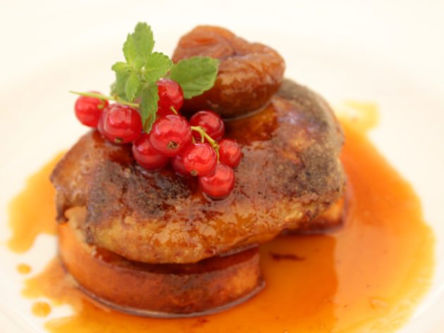Sült libamáj karamellizált almával pirított kalácson, fügével (Merops Étterem, Szekszárd)