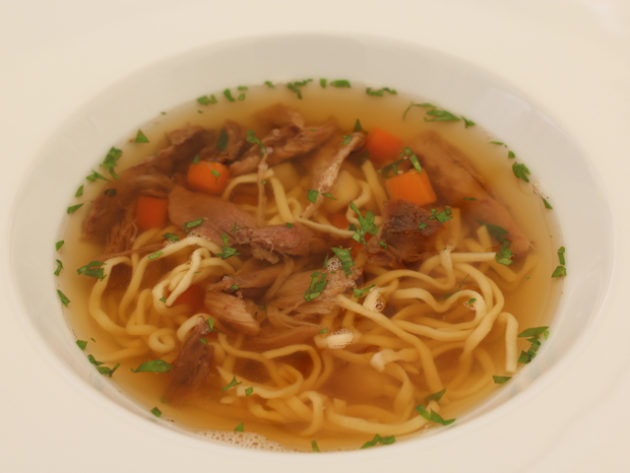 Fácán erőleves zöldségekkel házi tésztával (Merops Étterem, Szekszárd)