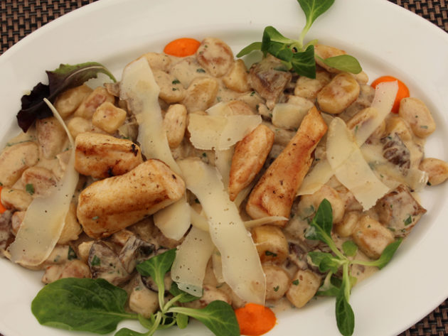 A levest követő fogás a szekszárdi ebéd emlékezetes étele: Házi gnocchi tejszínes gombákkal, nyúlgerinc filével.
