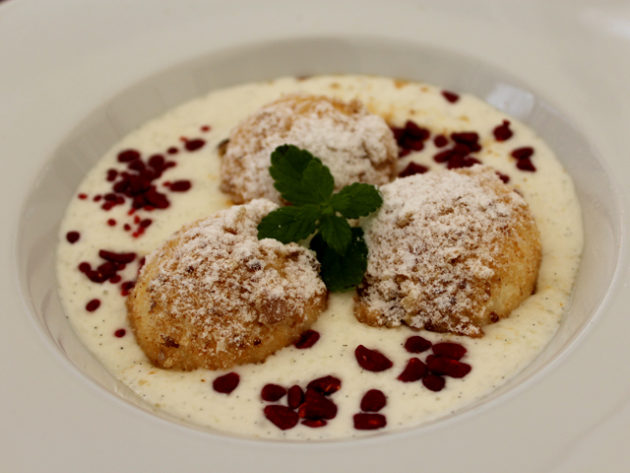 A választott desszertem egy magyar klasszikus, a túrógombóc. A túrógombóc bőségesen mért, igazi, madagaszkári vaníliával ízesített tejföllel és fagyasztva szárított málnadarabkákkal körülölelve érkezik.