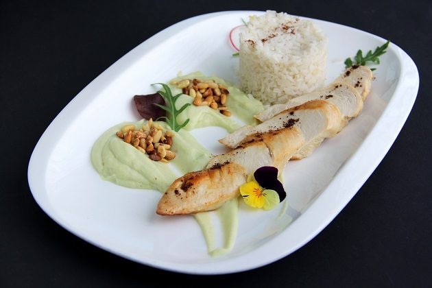 Csirkemell steak édesköményes jázminrizzsel, fenyőmagos karfiolpürével