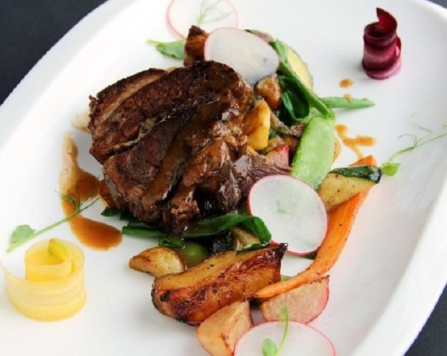 Konfitált marhanyak pirított tavaszi zöldségekkel, whiskey-s glasszal