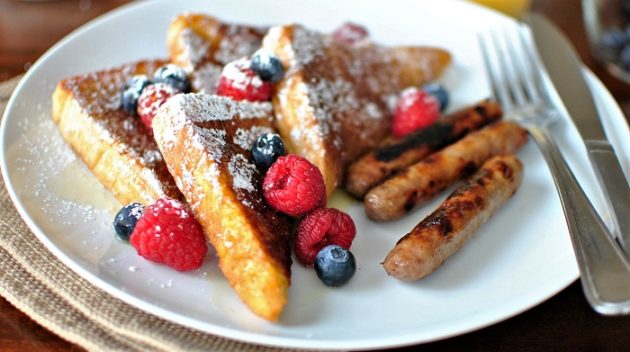 Fahéjjal és cukorral megszórt bundás kenyér, gyümölcsökkel, grillezett kolbásszal (Forrás: SimplyScratch.com)