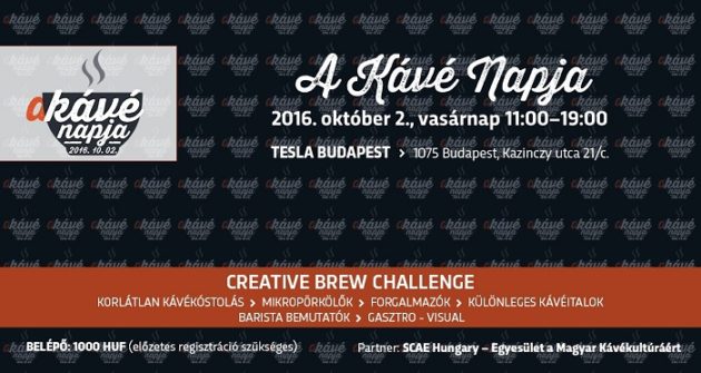 A KÁVÉ NAPJA 2016 – Ötödik alkalommal ünnepeljük meg a kávé világnapját Budapesten! A Kávé Napja 2016 rendezvény idén új helyszínen, a Kazinczy utcai Tesla Budapest épületében és udvarán zajlik. A hely kapacitása miatt a részvétel előzetes regisztrációhoz kötött az info@presspirit.hu címre küldött levélben (név, e-mail, létszám, tárgy, regisztráció) vagy a weboldal regisztrációs felületén. Belépő: 1000 Ft (készpénzes fizetéssel a helyszínen), amely tartalmazza az egész