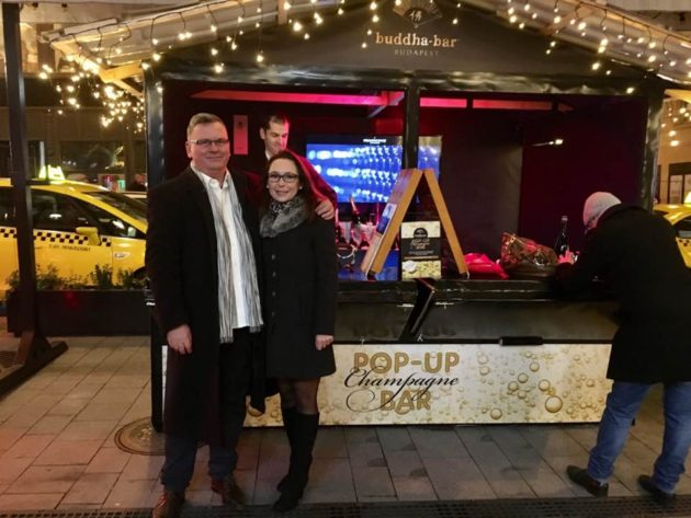 Pop-Up Champagne Bar, Váci utca (A képen. Csíki Sándor. Oláh Noémi, s a háttérben Borsos Gergely, aki karddal csapja le az üveg nyakát