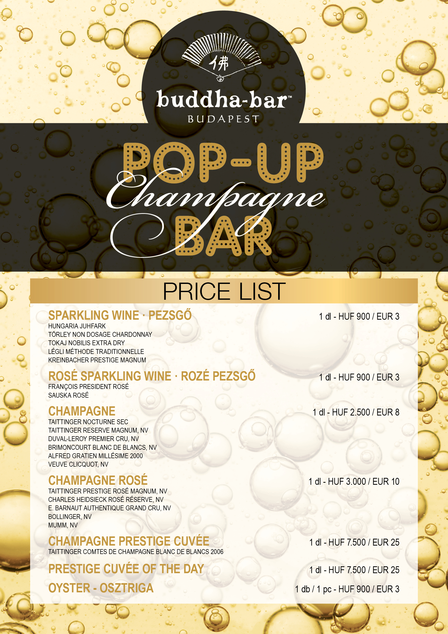 POP-UP CHAMPAGNE BAR – Idén egy hónapon át tartó ünnepléssel várjuk az év legcsodálatosabb időszakát, s ez idő alatt a legexkluzívabb champagne-okat kínáljuk kóstolásra, akár pohárral is. Találkozzunk minden nap december 4. és 23. között 15:00-tól 23:00-ig a Váci utcai Pop-Up