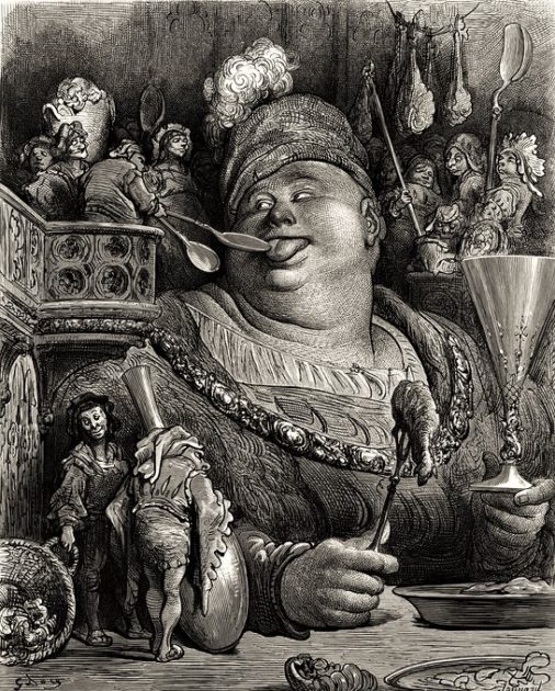 A könyv egyik, Vinkó József által feltehetően különösen kedvelt illusztrációja: A fiatal Gargantua ebédje, Gustave Doré metszete, 1851