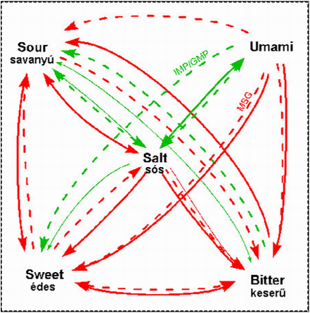 • Az ábrán: Öt alapíz bináris egymásra hatása. A vonalak vastagsága a koncentrációra utal, a zöld szín a fokozásra, a piros szín az elnyomásra. Az igazoltan 6. alapízről, a zsírról itt még nincs szó.