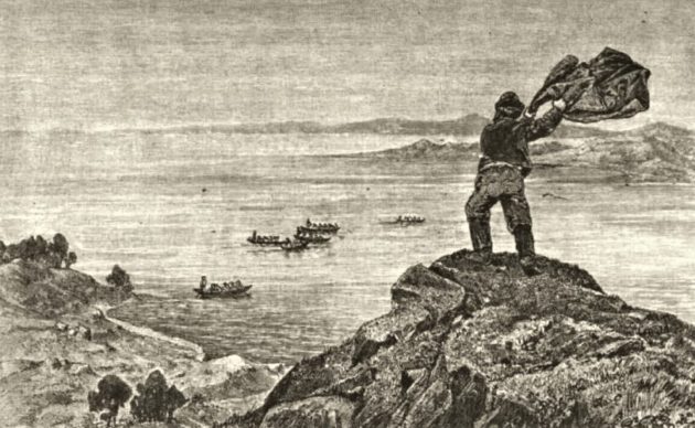 „Látott hal. A látott hal-ra való halászat, ősz végén, ’mikor a garda határba vót’, azaz titokzatos vándorlásban hatalmas, sűrű tömegekben jelentkezett, – nem volt egyéb, mint kótázás. Csak a ’szerencse’ volt biztosabb, sőt legtöbbször – ha a kilátás tiszta volt –: bizonyos. A garda tömegét a vízen mutatkozó ’lilaszínű’ folt mutatta, amit a „hegyről”, a tihanyi tekintők egyikéről vagy másikáról lehetett észrevenni. Minden bokornak volt etájt figyelője: a hegyenjáró. Ő adott jelt a bokornak, ha ’meglátta a halat’, hogy induljanak s hogy merre haladjanak; még pedig a nagy távolság s esetleg szél miatt nem szóval, hanem jellel. Bár szót is mellékelt a jelhez. De ezidőtájt többé-kevésbé minden tihanyi fölcsapott hegyenjárónak, s ha meglátta a halat, gardát kiáltott. Mezőn, szőlőben dolgozók, pincézők, ha a vízre láthattak, egyaránt figyeltek s a garda híre pár perc alatt falun, parton szétfutott. A bokrok versenyre kelve iramodtak a vízre, s ha egyik-másik halásztárs egyéb munkában volt, szerszámát elhányva futott a partra, hogy a fogásban és szerencsében részt vehessen. Minden hegyenjáró egyesegyedül a maga kompániája hajóját figyelte és irányította s minden hajó csupán a maga irányítóját nézte. A hegyenjáró úgy állt, hogy alakja ’a levegőben legyen’, az ég legyen a háttere, hogy jeleit a távoli hajótól tisztán láthassák. Jeladó szerszámja kabátja, subája, halásztarisznyája, valami zsák vagy más hasonló volt, amivel a következő jeleket szokta adni: 1. Előre! – 2. Jobbra! – 3. Balra! – 4. Vessétek ki a macskát! – 5. Vessétek ki az istápot! (istáp: vezérfa az öregháló két végén – AL) – 6. Kerítsétek! – 7. Riasszátok! Ezek jelzése a fenti rendje szerint: így történt: 1. háta mögül előre, 2. jobbra, 3, balra csapkodott a tarisznyával (zsákkal stb.), 4., 5., 6 balra dűlve földre vetette magát, 7. csomóba fogott ruhával szétvetett lába között hátra csapkodott (11. ábra). Egyéb jelekről, vagy csalafinta, megtévesztő jeladásról a ma élők nem tudnak. A hegyenjáró különben nem bírja a jelzést szó nélkül. Legalább Farkas Károl, talán az utolsó hegyenjáró, aki nekem lefényképezés végett az Akasztódomb csúcsán tudományát bemutatta, először is hajóra haj! – kiáltást hallatott s azután is, ahogy foga közül bosszúsan szokta szűrni az ember, jeleit szóval is megpótolta, így: Ergyetek avval a hajóval! – Vessétek ki azt az istápot! stb.” Viski Károly: Tihany őshalászata. (Néprajzi Értesítő, 1932.)