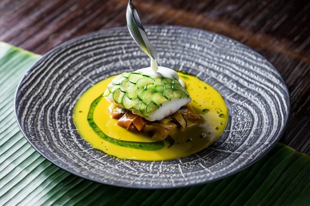 - Első fogás: Tápióka chips citromfüves tengeri sügérrel