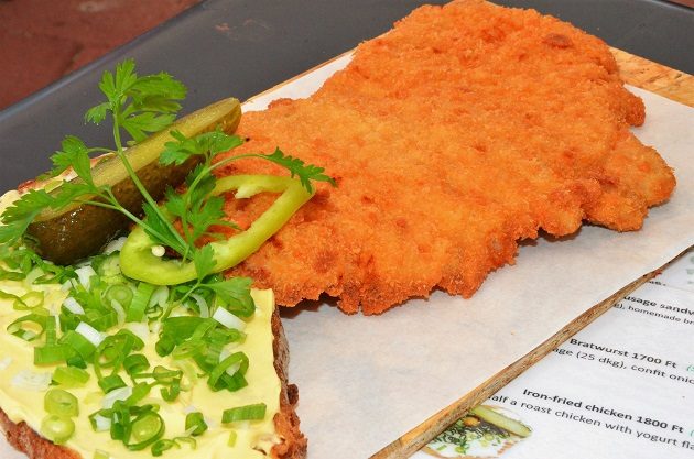 Ez ugyanis egy 17-18 dekás, vastagra hagyott párizsi „szelet” kovászos kenyéren, amit házi, lágy majonézzel kennek meg. Erre helyezik a steak méretű párizsit, szeletelt főtt tojást és zöldséget, csemegeuborkát. A lényeg azonban, hogy a párizsi duroc sertésből készül és ugyanabból a dunabogdányi kisüzemből érkezik, ahonnan a már népszerűvé vált méretes, csodás piaci lecsókolbász, amit nem kell nélkülözni a Palatinuson sem (1700 Ft).