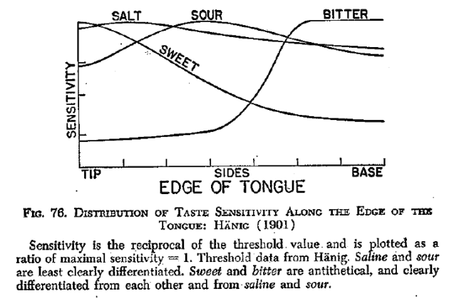 - Bár Boring továbbra is relatív értékeket ábrázolt, félrevezető ábráját hamarosan úgy kezdték el interpretálni, hogy a csupán relatíve csekélyebb érzékenységű nyelvterületeket már az adott ízre érzéketlen területekként ábrázolták. Ezzel pedig megszületett a jól ismert, de téves nyelvtérkép.