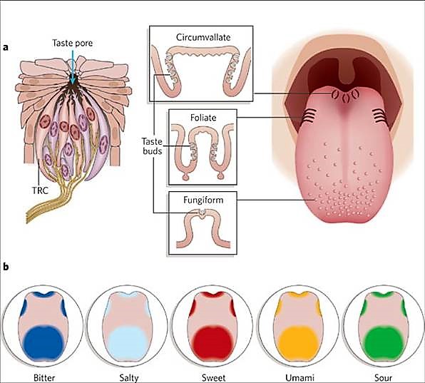 Az ábrán, középen, az ízlelőszemölcsök típusai (körülárkolt, levélalakú, gomba alakú), balra fent egy ízlelőbimbó, a hám felszínén lévő ízlelő pórussal és az ide terjedő ízlelősejtek mikrovillusaival. Minden alapízt, a nyelv minden részén érzékelünk, nincsenek kitüntetett lokációk. Mindenütt hasonló intenzitással érzékeljük a keserű, a sós, az édes, az umami és a savanyú ízt is. (TRC = Taste Receptor Cell, vagyis: ízérzékelő sejt)